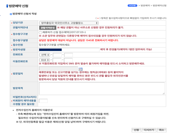 * 출입국사무소는 월-금 오전 9시 ~ 오후 6시 까지 운영하며 당일, 주말, 공휴일에는 예약이 불가능합니다.